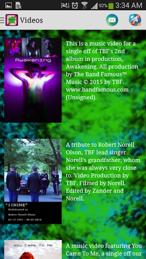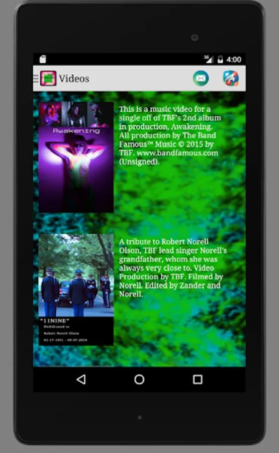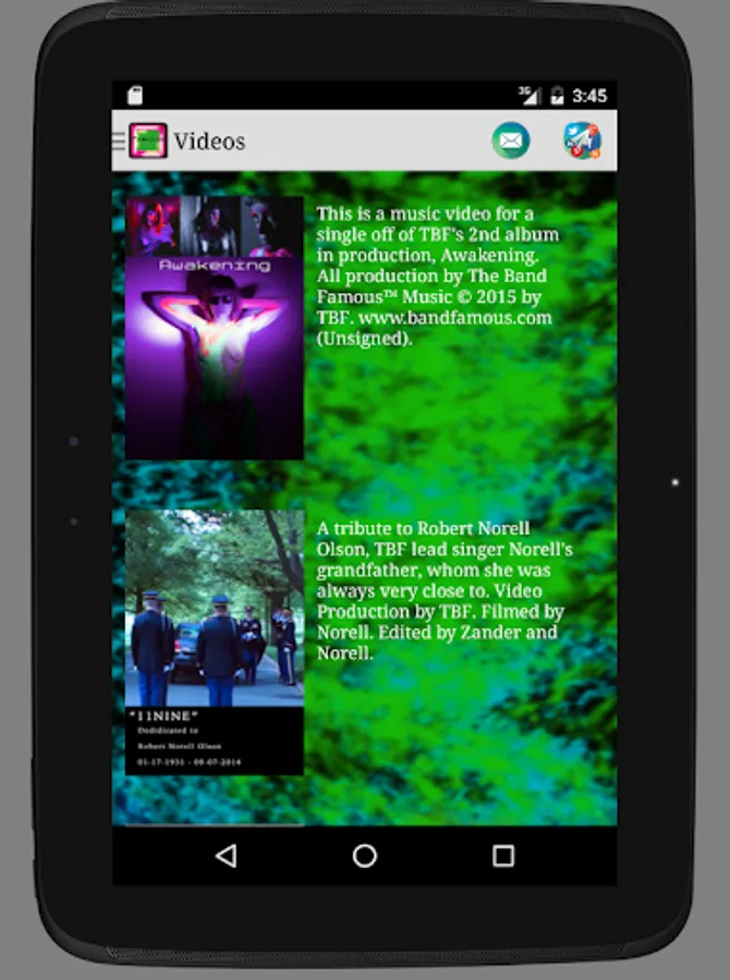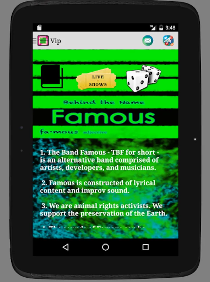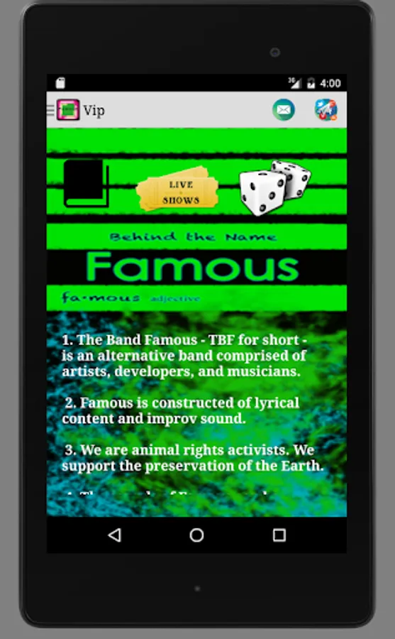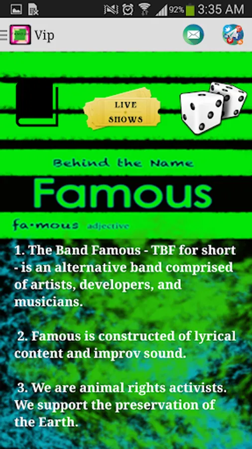 -Email the band directly with a tap of the info icon. This will open your mail app and pre-populate a message you may send to The Band Famous.