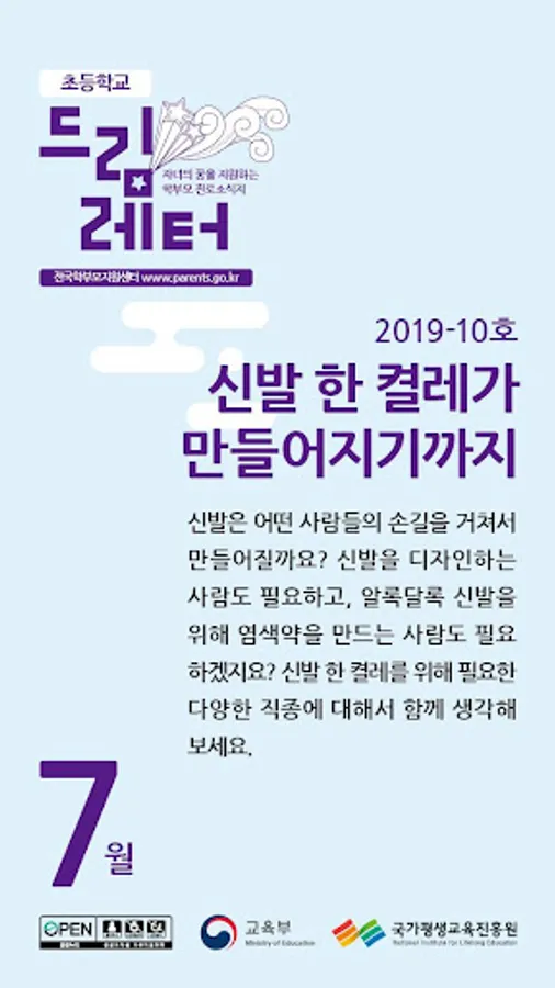 [드림레터]는 교육부와 국가평생교육진흥원(전국학부모지원센터)에서 발행하는 학부모 진로소식지입니다. 교육부와 국가평생교육진흥원(전국학부모지원센터)에서는 학부모를 위한 다양한 형태의 진로교육지원 콘텐츠를 개발하고 있습니다.