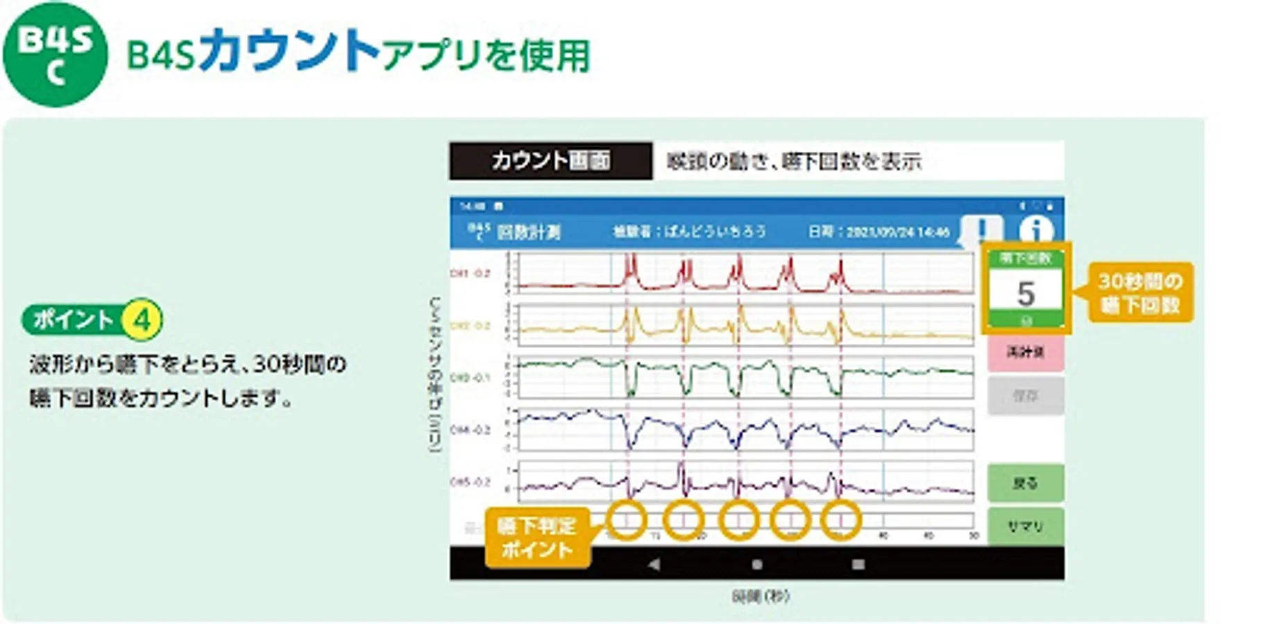 ・ The swallowing movement monitor B4S is not a medical device. Talk to your healthcare professional about swallowing function assessments for the purpose of diagnosing, treating, or preventing illness.