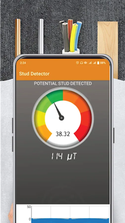 Stud scanner: stud detector is a cool application to find metallic things, studs, nails, and bolts in walls, hotels, and public places around you which are not visible to you. The function of a handheld real metal detector is to measure the metals. Wall detector & detector de Madera find studs, and sand screws in the wall. Stud Detector: Stud Finder Scanner uses your device's sensor (magnetometer) to precisely find studs by pinpointing metal joists, nails, screws, or any other metal located beneath the drywall, plasterboard, or sheetrock in the wall. Metal finder works as a wall detector, wood detector, and detector de Madera.