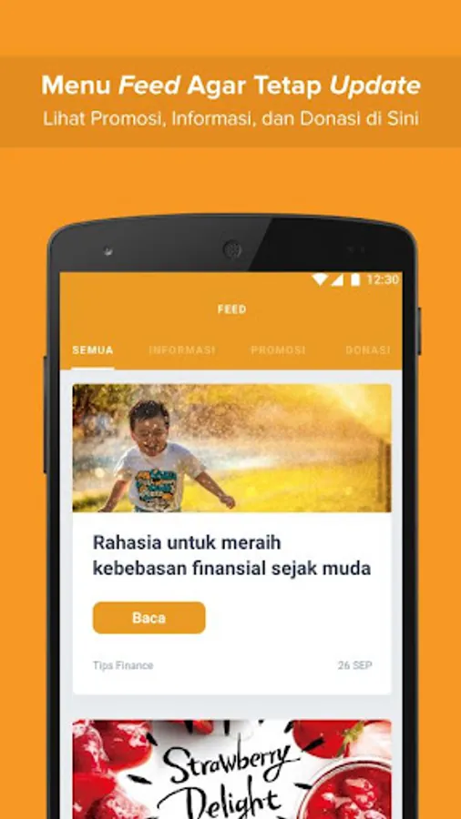 - Feed: Menu untuk melihat informasi, promosi, dan donasi yang ter-update.