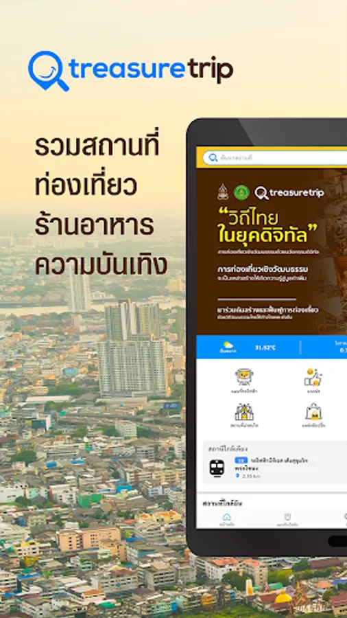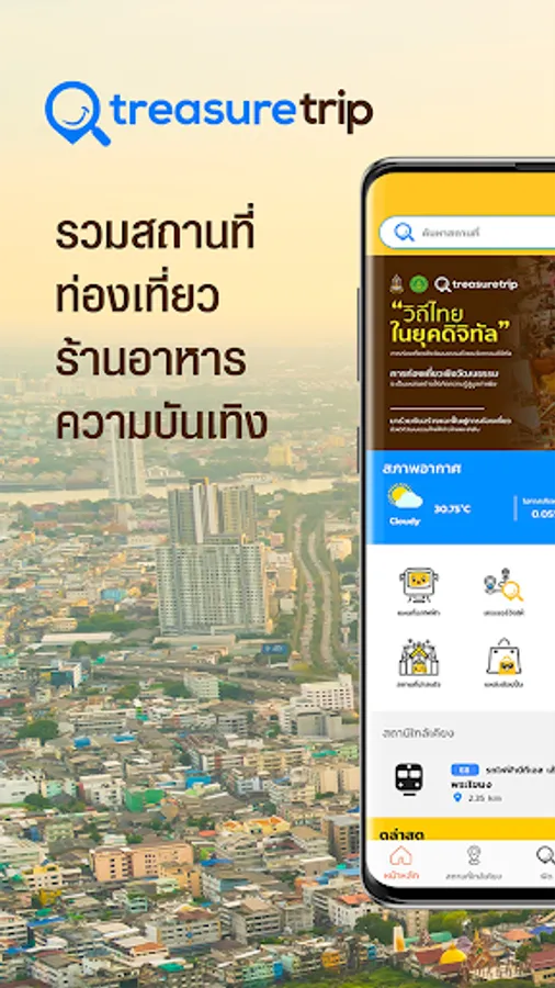 Treasure Trip is an application that collects tourist information in Thai culture along the skytrain route, complete with places such as community attractions, restaurants, accommodation, temples, museums, to facilitate tourists to travel to various places by themselves. have Just at your fingertips to select the desired location on the application. The application will be able to navigate to the desired destination. As well as showing detailed information about various locations So that tourists can make plans and make decisions before traveling to that location There are also travel plans that suggest that tourists can travel along the route that has been designed.