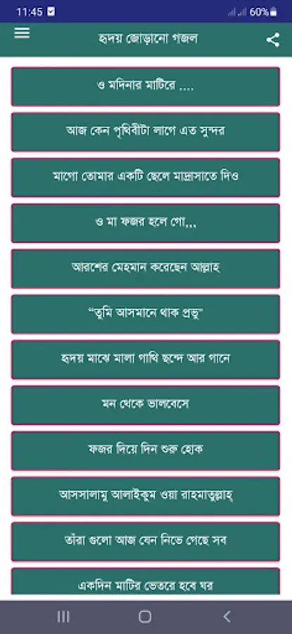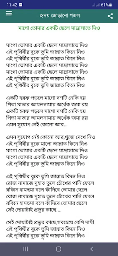 Friends, I have created this app by collecting the lyrics of several ghazals that you like. I hope you will like this app of Bengali ghazals! This app contains a collection of beautiful beautiful ghazals, I believe this app of Islamic spiritual ghazal lyrics will touch your heart.