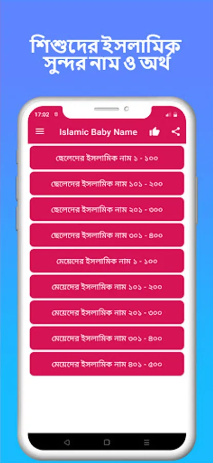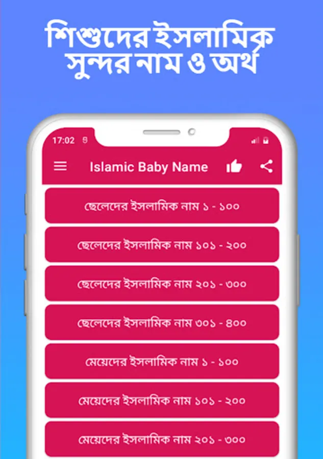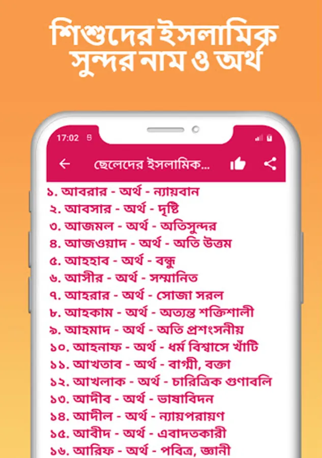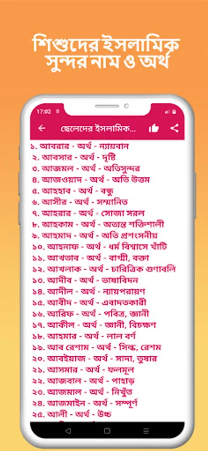 এই অ্যাপ্লিকেশনে শিশুদের ইসলামিক নামের নামের অর্থ পাবেন, যেমন নামের অর্থ, সংক্ষিপ্ত বর্ণনা, নামের উচ্চারণ ইত্যাদি।