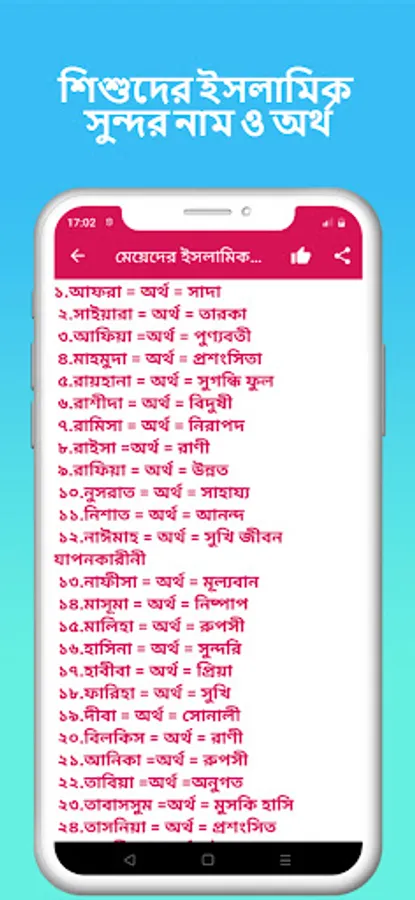 শিশুদের ইসলামিক নাম ও অর্থ এপটি একটি শিশুদের ইসলামিক নাম সম্পর্কিত সম্পূর্ণ বাংলা অ্যাপ্লিকেশন। এই অ্যাপ্লিকেশনে আপনি শিশুদের নতুন নাম সন্ধান করতে পারেন এবং তাদের নামের অর্থ জানতে পারেন।