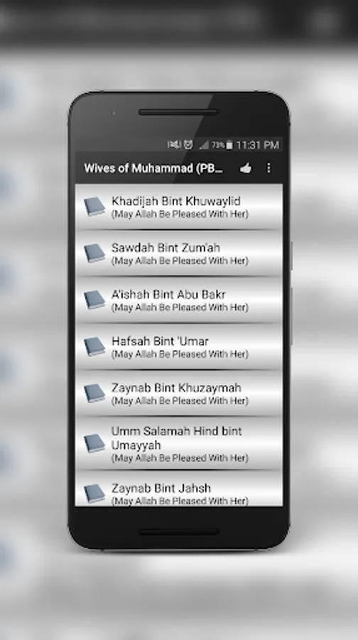 Just like two other applications, "Quran Stories" and "Stories of the prophets", Wives of Muhammad (PBUH) is another application of islamic stories which presents the life description of the wives of our beloved prophet Muhammad (PBUH). This book is also written by Ibn Khatir. The names of the wives of Prophet Mohammad (PBUH) are as follows,