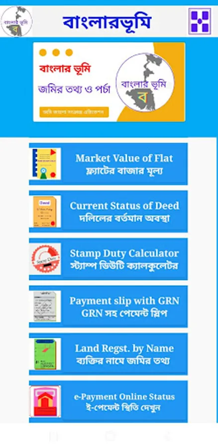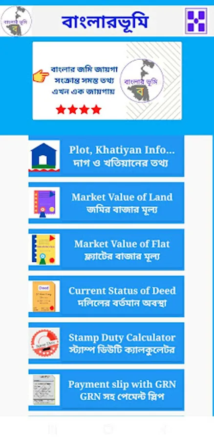 বাংলার ভূমি অ্যাপের সাহায্যে আপনারা যেকোনো জমি-জায়গার সমস্ত তথ্য যেমন - খতিয়ান, দাগ, মার্কেট ভ্যালু, স্ট্যাম্প ডিউটি, ল্যান্ড রেকর্ড এবং আরও অনেক তথ্য সহজেই পেয়ে যাবেন।