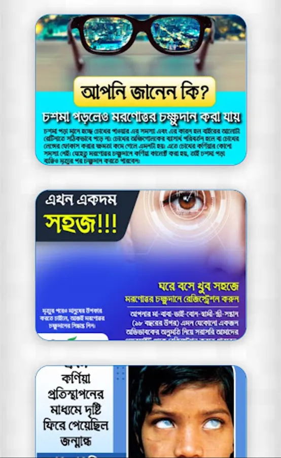 ’Eye Donation BD’ এ অ্যাপ তৈরি করেছি যা আপনাকে চক্ষুদান বিষয়ক সকল তথ্য জানাতে পারবে… ওয়েবসাইটের মাধ্যমে মরণোত্তর চক্ষুদাতা হিসাবে আপনি রেজিস্ট্রেশন করতে পারবেন…