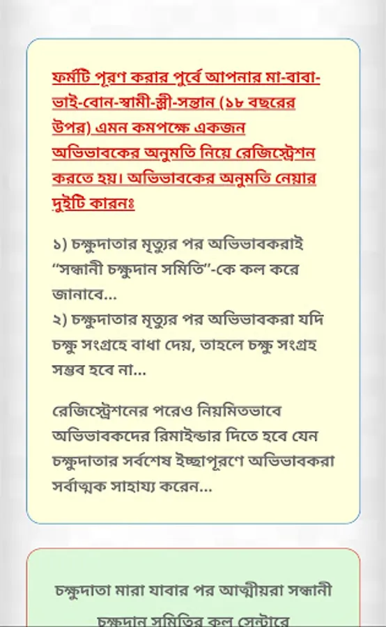 মা-বাবা-ভাই-বোন-স্বামী-স্ত্রী-সন্তান (১৮ বছরের উপর) এমন যেকোনো দুইজন অভিভাবকের অনুমতি নিয়ে মরণোত্তর চক্ষুদানে রেজিস্ট্রেশন করতে হয়... দুইজন অভিভাবকের অনুমতি নেয়া অবশ্যই জরুরি কারণ মরণোত্তর চক্ষুদাতার মৃত্যুর পর অভিভাবকদের সহযোগিতা ছাড়া চোখ সংগ্রহ সম্ভবপর হয় না… তাই শুরুটা করতে হবে পরিবার থেকে …