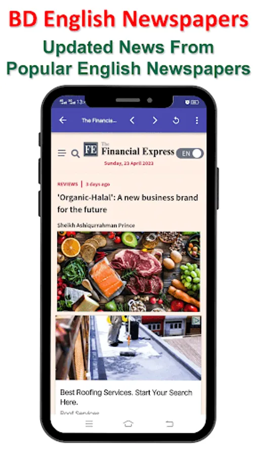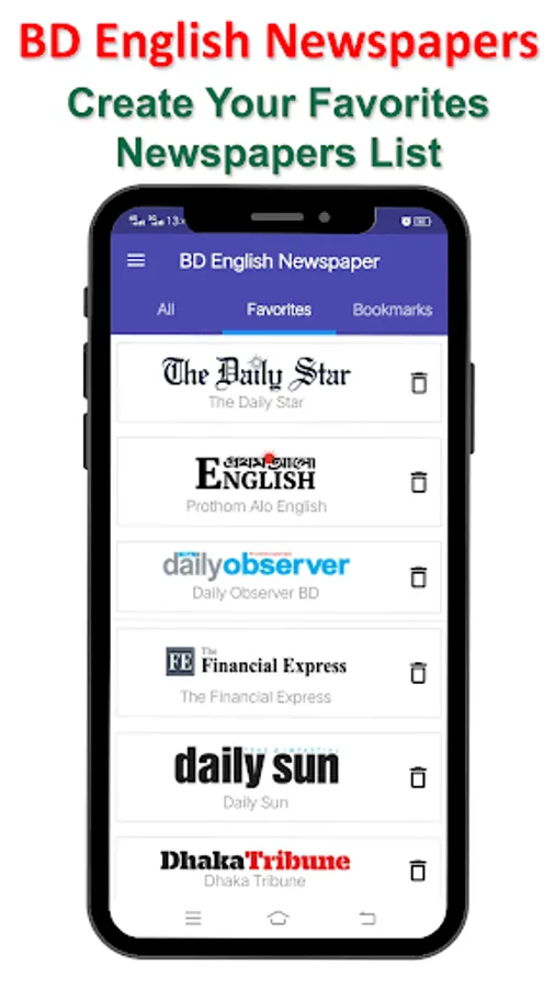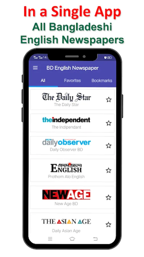 List of English Newspapers in this app: The Daily Star, the Independent BD, New Age BD, The Daily Observer, Daily Sun, Bangladesh Post, The Financial Express, The Independent, The Asian Age, Prothom Alo (English), Bangladesh Monitor, The Dhaka Post, Business Insider, Citizen Times, Daily Industry, People's Times, Tribunal, The Business Post, New Nation, The Business Standard, The Good Morning, Weekly Holiday, Dhaka Tribune and more.