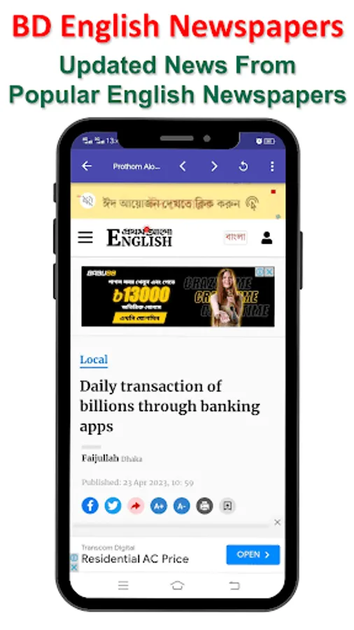 Install our BD English Newspapers app and get updated daily.