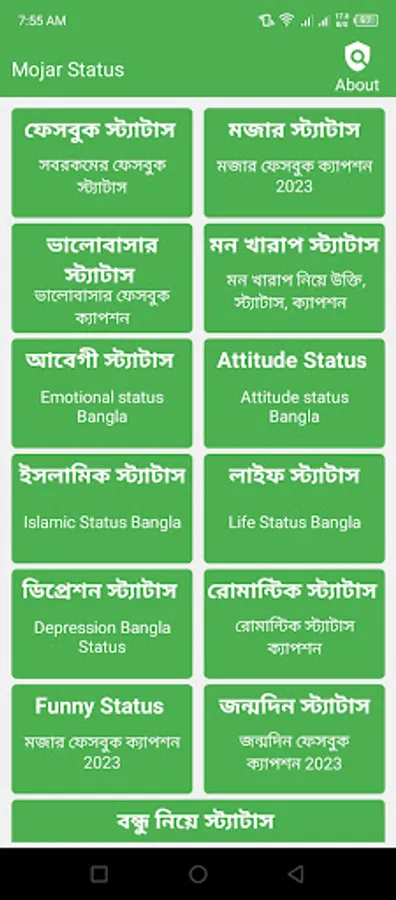 তাই আর দেরি কেন? সকল জনপ্রিয় স্ট্যাটাস গুলো দেখে নিন এক জায়গায়। ২০২৩ সালের আপডেট স্ট্যাটাস গুলো যুক্ত করা হয়েছে,আশা করি আপনি আমাদের অ্যাপটি মন থেকে পছন্দ করবেন। আর আমাদের App টি যদি আপনার ভালো লাগে তাহলে আমাদের অ্যাপটি সম্পর্কে ভালো কিছু লিখে যেতে ভুলবেন না।