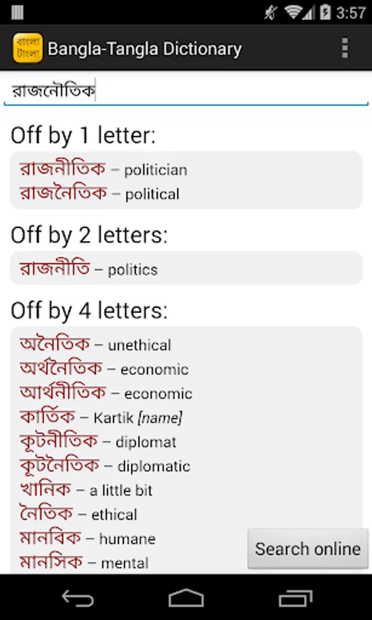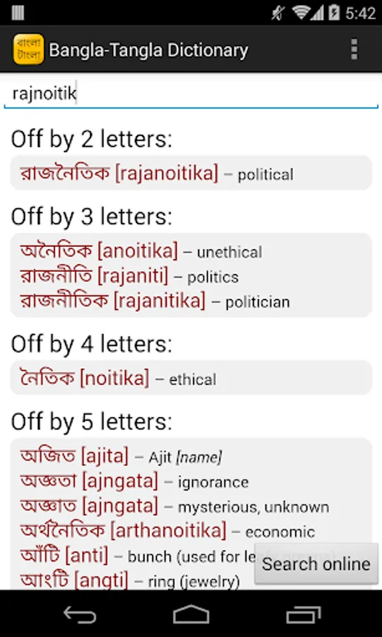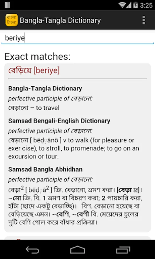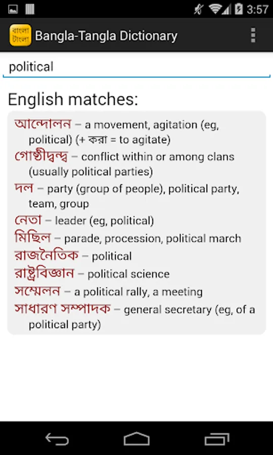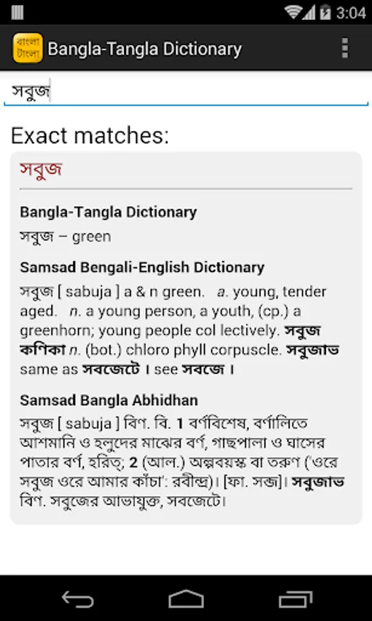 The Bangla-Tangla dictionary is the only Bengali to English dictionary with a powerful smart search system. You can look up words using Bangla script or Roman script, and if you don't spell the word exactly right you'll get back the closest matching words. You can also search the dictionary for English words, so it serves as a English to Bengali dictionary too. In online mode you get back results from two excellent online dictionaries by Samsad, one Bengali-to-English and one pure Bangla, in addition to the Bangla-Tangla dictionary. Online mode also lets you look up verb conjugations like সরিয়েছে and other word variants like দিনগুলিতেও.
