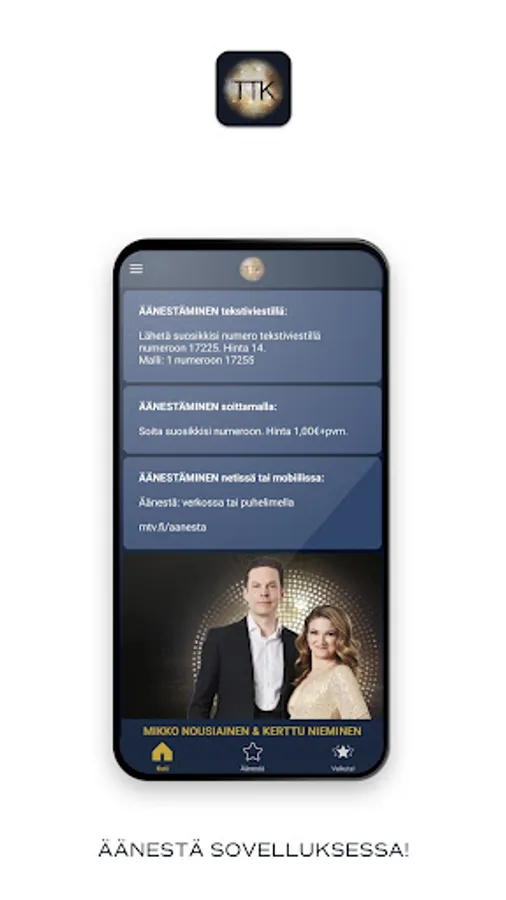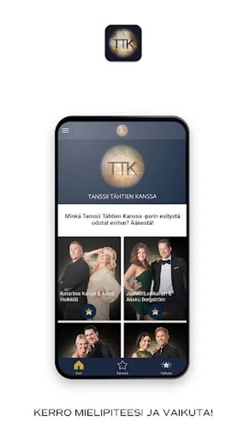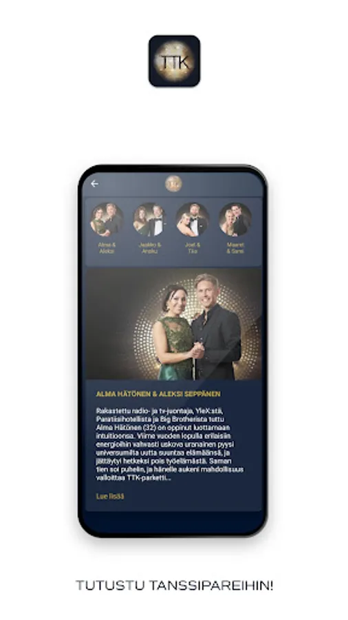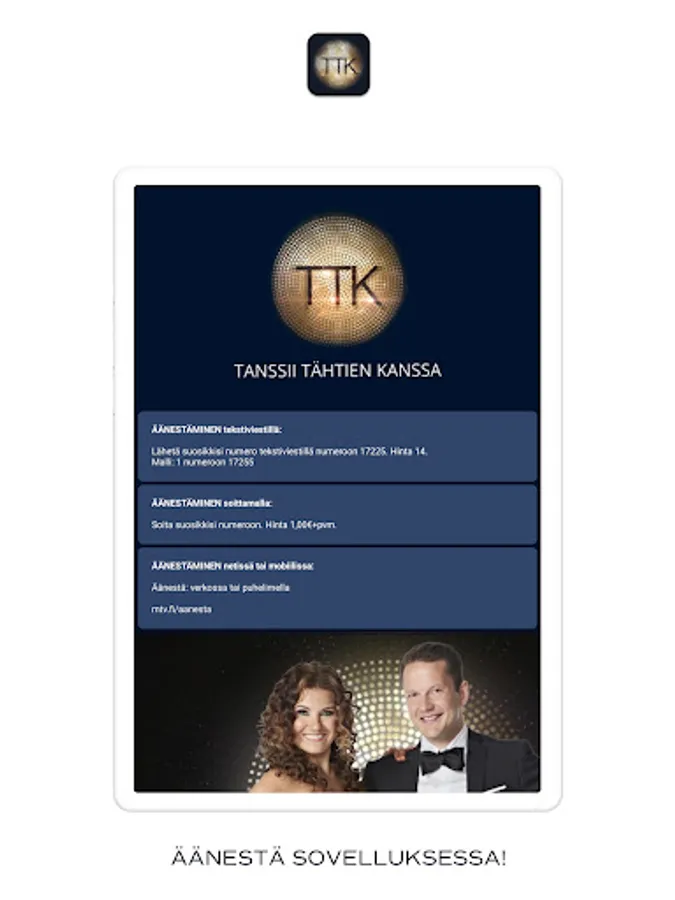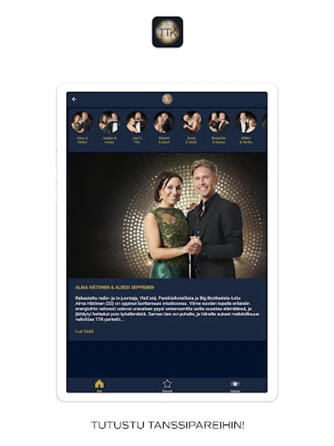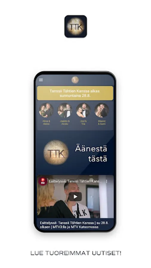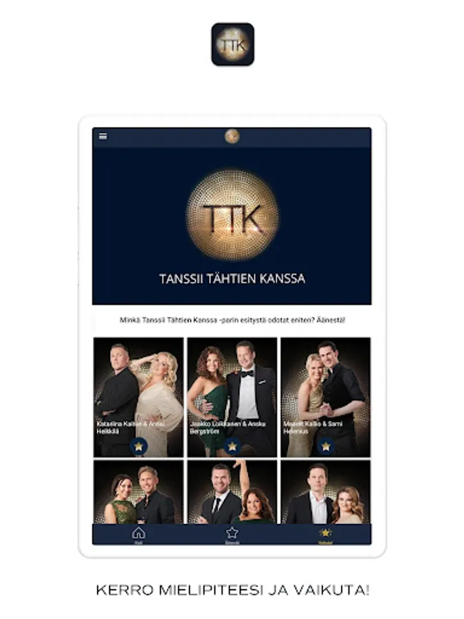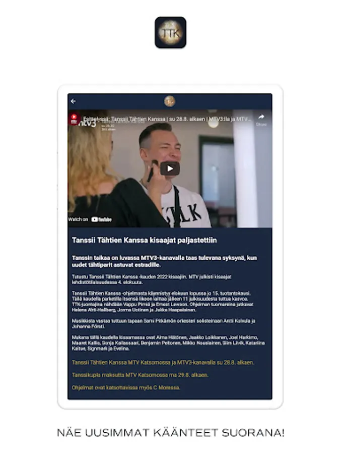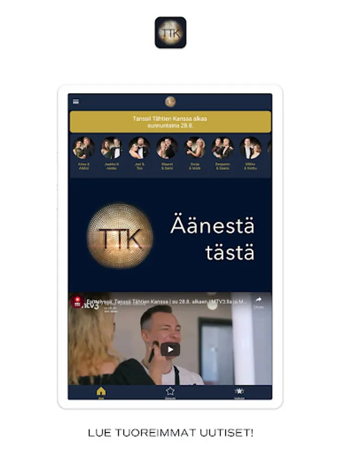 The award-winning favorite series Tanssii Tähtien Kanssa is here again! TTK's official application collects all the most sparkling content in one place and lets viewers peek behind the scenes. The user of the application also has the opportunity to influence the content during the season. Download the app and join the whirlwind of dance!