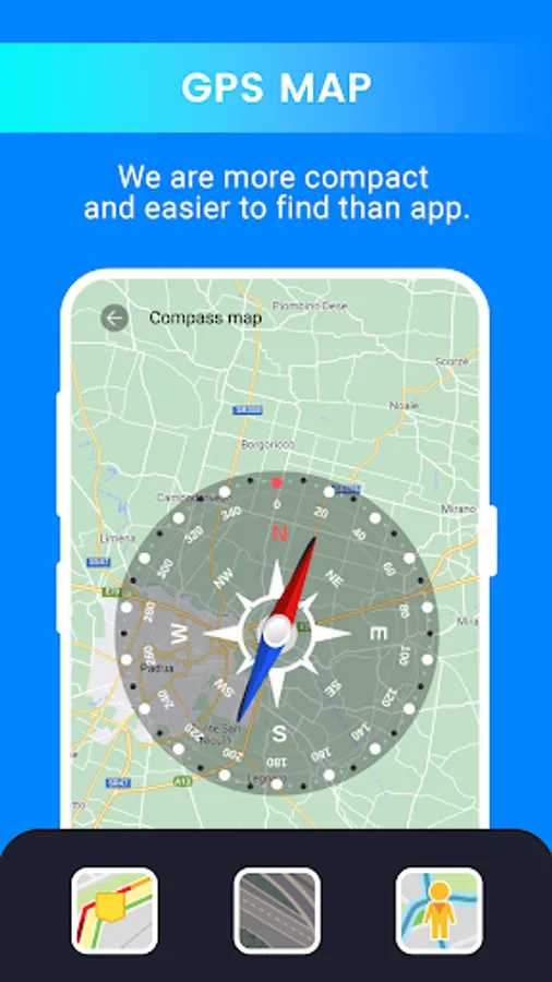 🗺 Compass Maps: Helps display the actual location (lat, lng) where you are standing on the Google Maps map.