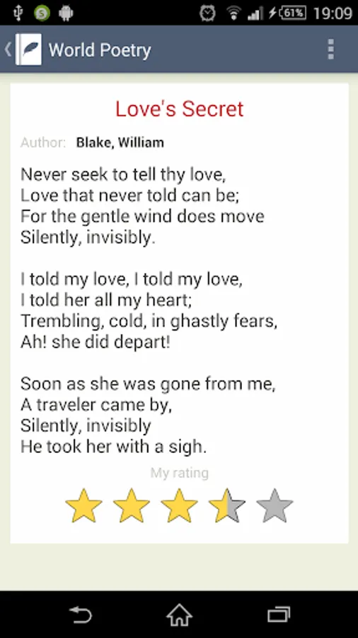 World poetry - more than 18,000 poems from classical to contemporary. Authors catalog, convenient search, browsing history, random selection of the poem.