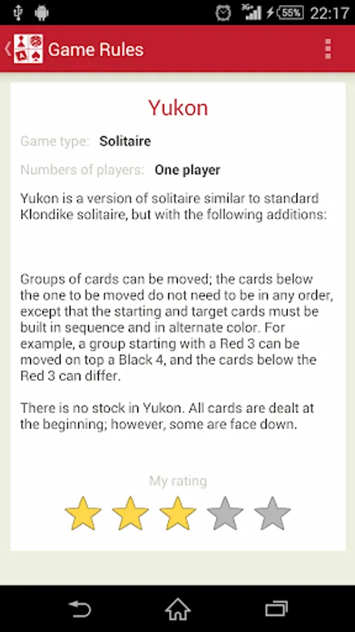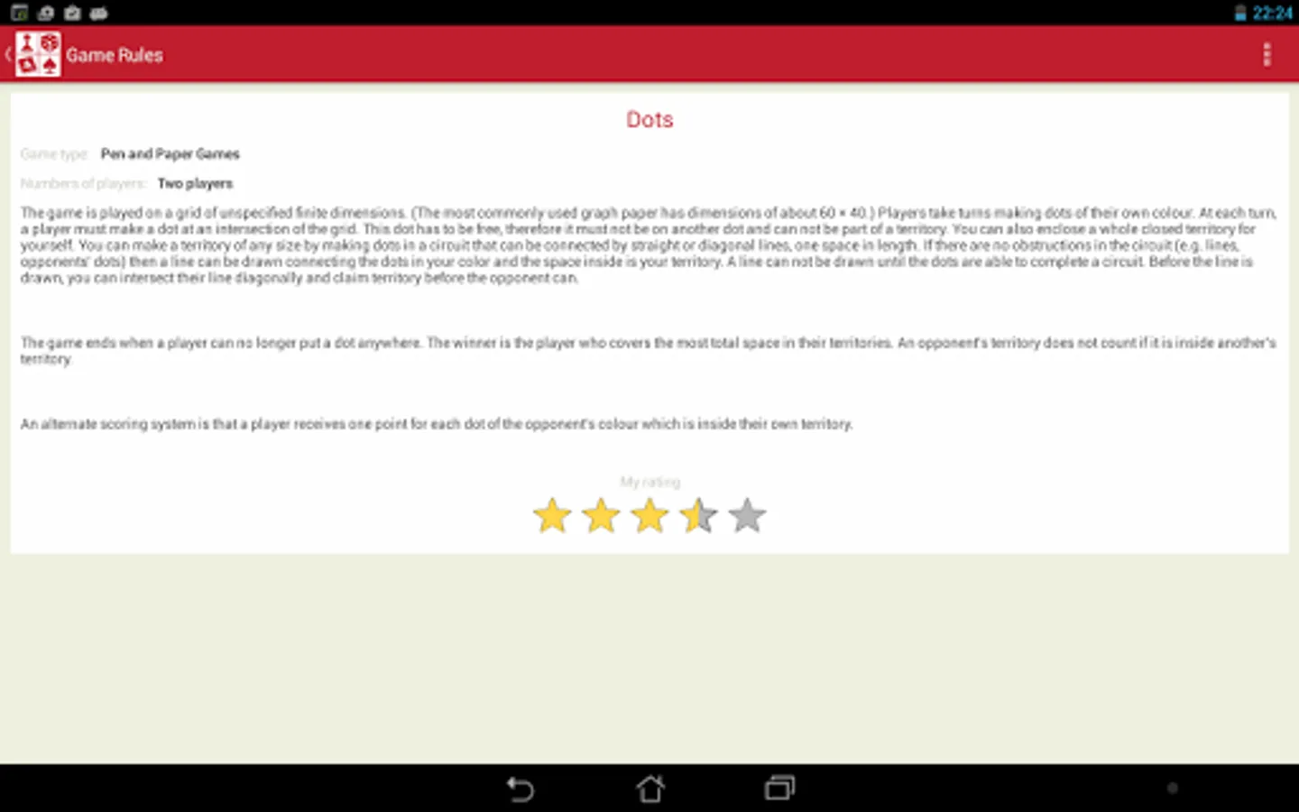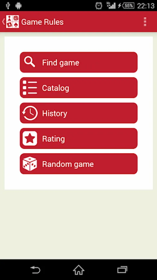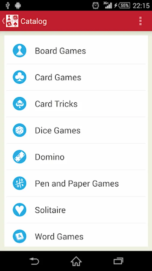 Descriptions and rules of over 110 games with convenient search and rating ability. The catalog contains the following sections of the games: Word Games, Dice Games, Card Games, Card Tricks, Solitaire, Domino, Pen and Paper Games, Board Games. Search allows you to pick up the game for a certain number of people.
