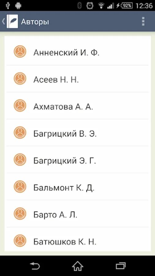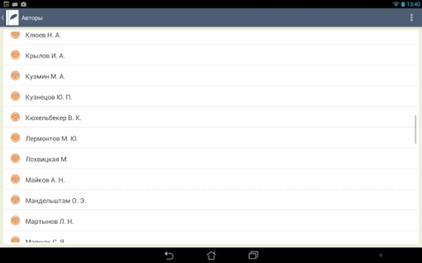 The database contains poems following authors: Agnes Barto, Alexander Blok, Alexander Polezhaev, Alexander Pushkin, Alexander Radishchev, Alexander Twardowski, Alex Pleshcheyev, Alexei Tolstoy, Anna Akhmatova, Apollon Grigoriev, Apollo Mike, Arseny Tarkovsky, Athanasius Fet, Boris Pasternak, Valery Bruce, Varlam Shalamov, Basil Trediakovskii, Velimir Khlebnikov, Veronica Tushnova Wilhelm Kiichelbecker, Vladimir Mayakovsky, Vladislav Khodasevich, Vyacheslav Ivanov, Gavrila Derzhavin, Gennady Shpalikov Daniel Harms, Dmitry Venevitinov, Eugene Boratynsky, Zinaida, Ivan Bunin, Ivan Krylov, Ivan Turgenev, Igor Northerner, Innocent Ann, Joseph Brodsky, Konstantin Balmont, Batyushkov Constantine, Constantine Vanshenkin, Lev Mei, Leonid Martynov, Maximilian Voloshin, Marina Tsvetaeva, Maria Petrova, Mirra Lokhvitskaya, Mikhail Kuzmin, Mikhail Lermontov, Mikhail Lomonosov, Nikolai Aseev Nikolai Aseev, Nikolai Gumilev, Nikolai Karamzin, Nikolai Klyuev, Nikolay Nekrasov, Nikolai Ogarev Nikolai Rubtsov, Tryapkin Nicholas, Nicholas Languages, Olga Bertgolts, Osip Mandelstam, Pavel Vasilyev, Peter Vyazemskij, Samuil Marshak, Sasha Cherny, Sergei Yesenin Sergei Mikhalkov, Fyodor Glinka, Fedor Sologub, Fyodor Tyutchev, Edward Bagritsky, Yunna Moritz, Yuri Kuznetsov, Yakov Polonsky, Jaroslav Smelyakov.