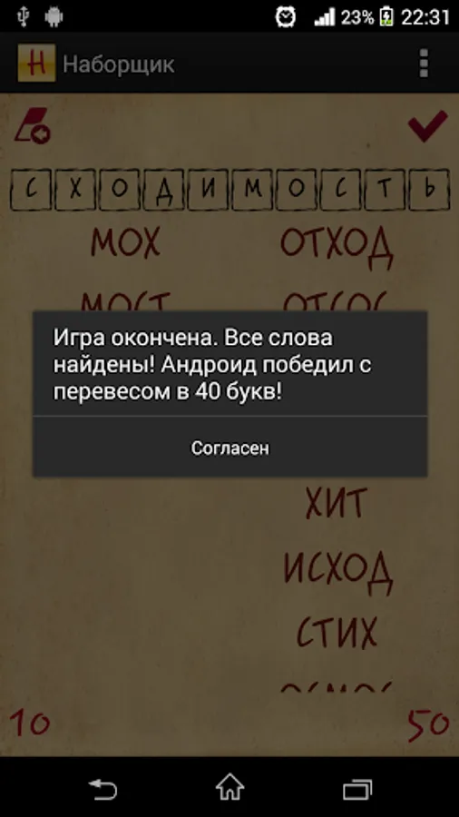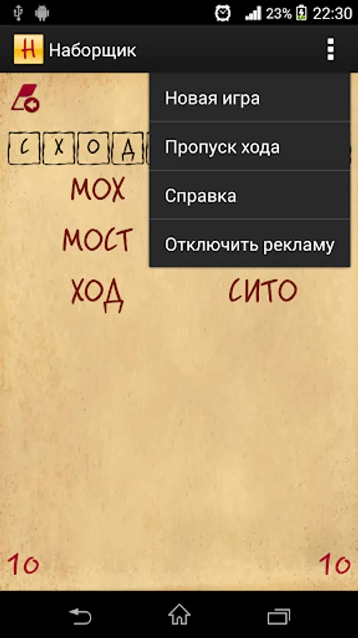 The classic game with words. Letters of a given word must make as many other words. Android player and take turns. Wins receives more letters in these words.