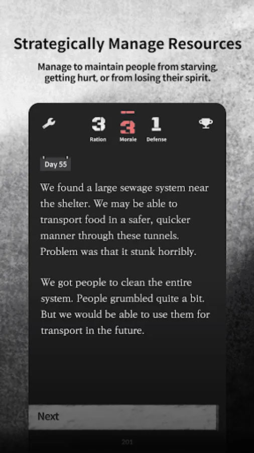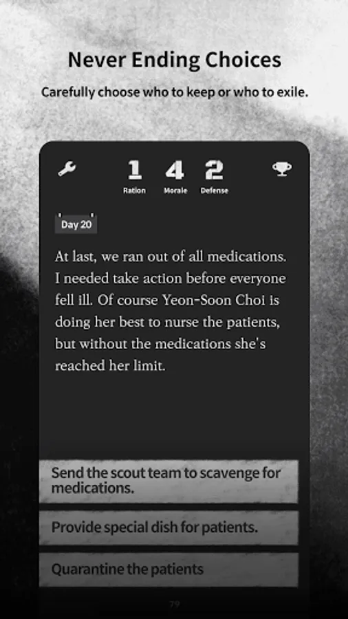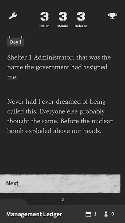 Ration, Defense, and Mentality are crucial for maintaining the Shelter. Manage to maintain people from starving, getting hurt, or from losing their spirit. As the state of the Shelter changes, the story will also transform.