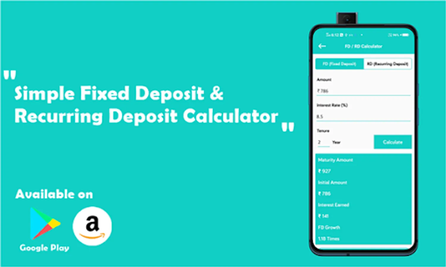 Fixed deposit calculator will help you to accurately calculate your fixed deposits as well as interest earned, and fd growth over a span of time on click of a button. App fd rate of interest calculator is lightning fast and highly efficient. Fd calculator app uses the yearly compounding to get the accurate result for you, all you need is to enter the initial amount, rate of interest as well as tenure.