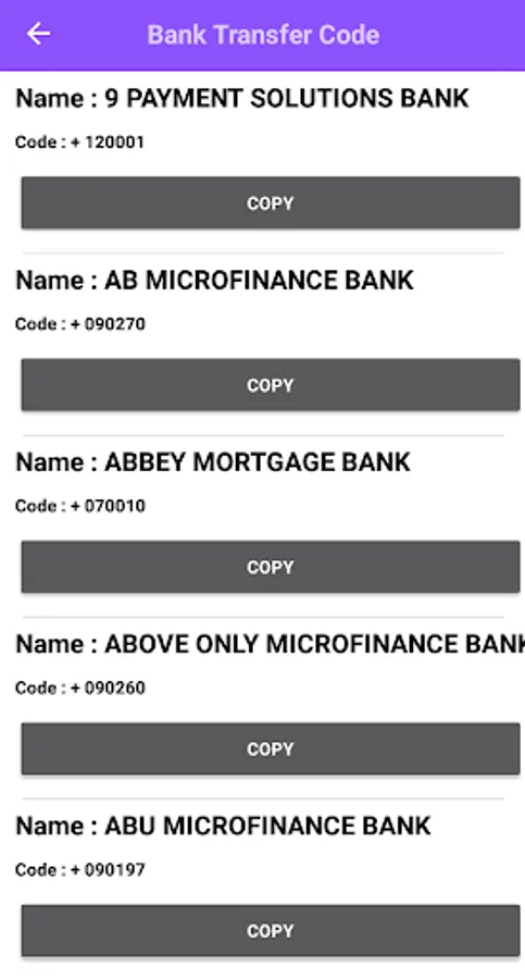 The app arranges the codes in a list backed with an explanation. They are your bank short codes to do transactions with them without visiting your banks. To use the app, identity your bank on the list and click on the copy button to perform your transaction.