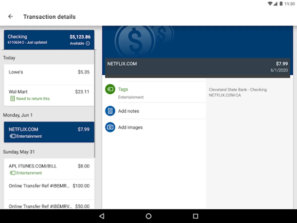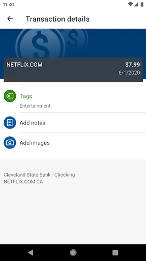 Add Tags, Notes, Images & Geo-Information: By enhancing transactions with custom tags, notes or photos of a receipt or check, you have the ability to stay organized and find exactly what you’re looking for when searching through your finances.