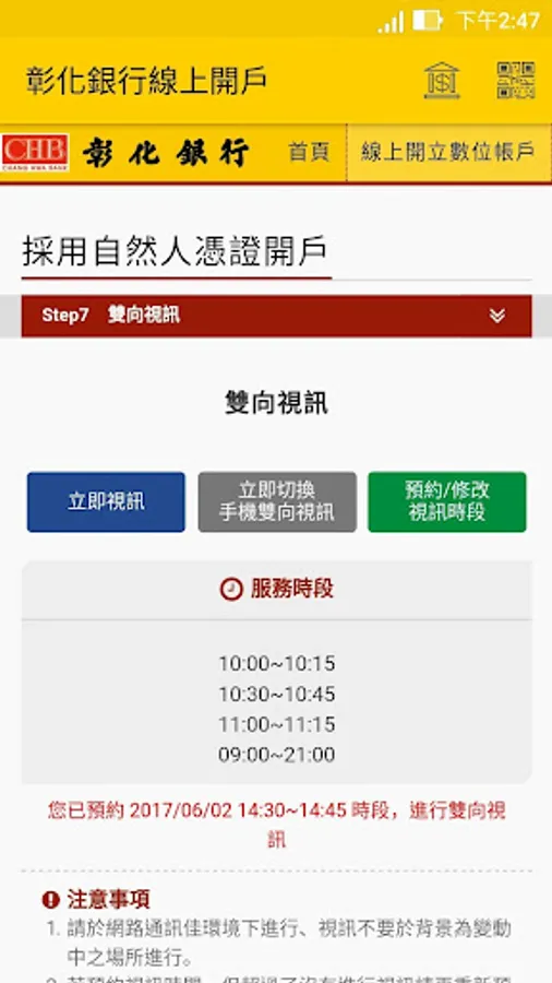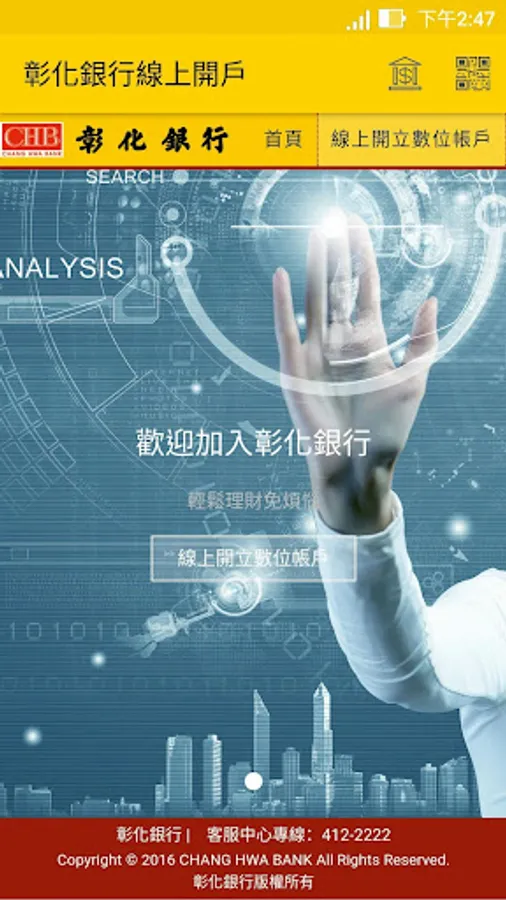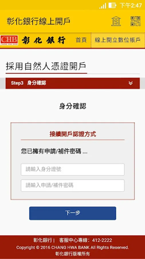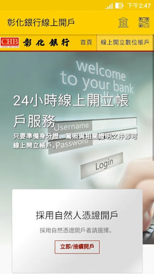 1.請至本行官方網站線上櫃台,完成自然人憑證或本行晶片金融卡驗證後設定密碼,即可以此密碼登錄線上開戶APP進行後續開戶步驟。