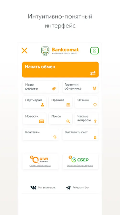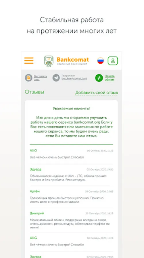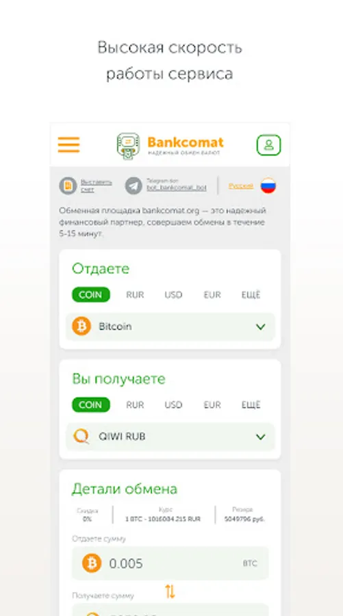The Bankcomat service is constantly improving both the service itself and the mobile application. You can be sure of the quality of exchange services.