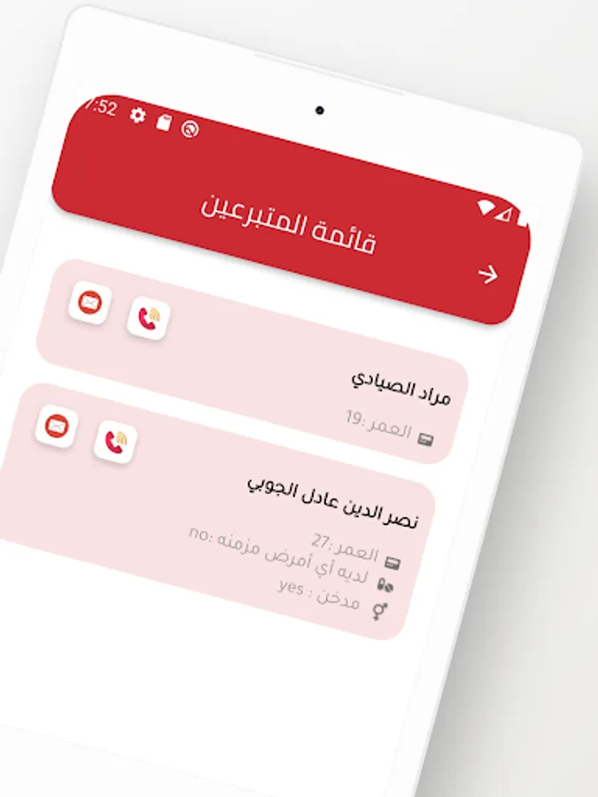 The blood application is a free electronic application through which the user can search for donors of the same type and who are near the blood searcher geographically and seeks to reduce the gap between the donor and the researcher by communicating with donors easily (by calling or SMS messages). Through the application, you can easily add donor data from blood type and from any region. The application is characterized by a distinctive icon for ease of opening and use, and a simple and uncomplicated interface consisting of two parts: a section for the blood type searcher and a section for those willing to donate.
