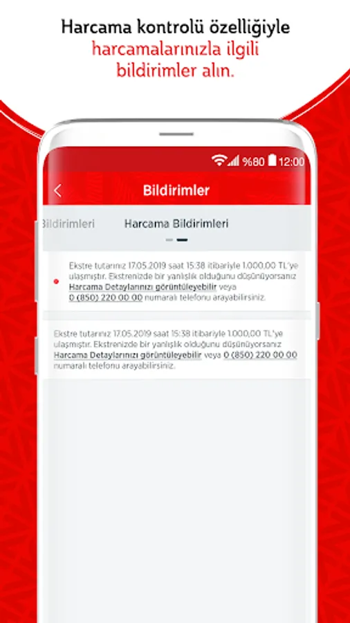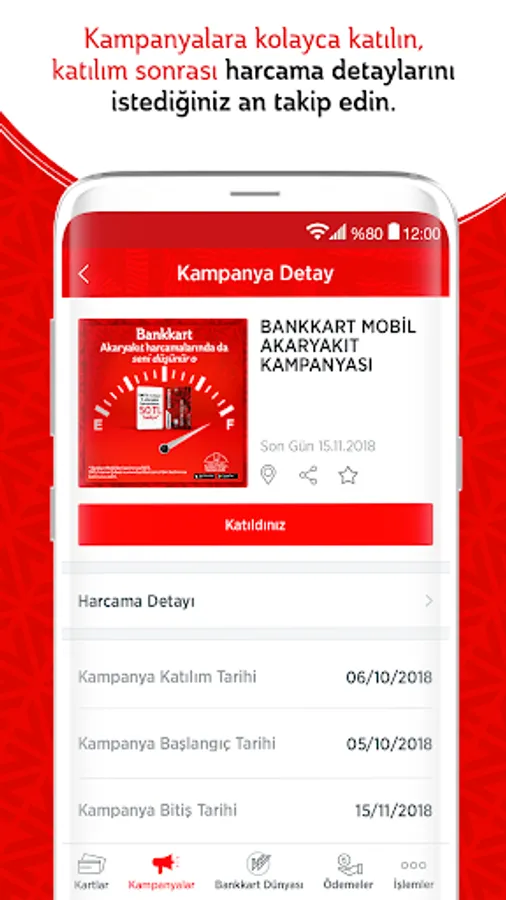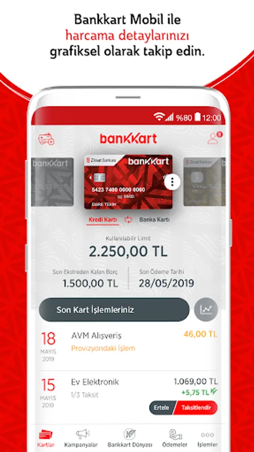 Bank cards can easily access all the information on your card for Mobile, you can track your spending in the sector details. Subsequent installment in advance, spend, operations such as Snooze, you can perform instantly with the quick buttons on the appropriate action, you can determine your card password, you can change your card settings to use your card and you can close temporarily. Expenditure control feature allows access to a certain amount, you will be notified when you fall into extreme or limit the amount you set, you can control your spending as you wish.