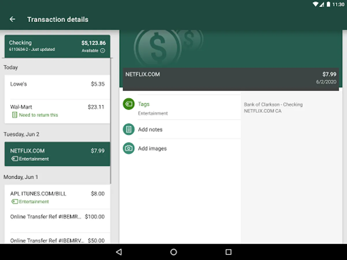 Add Tags, Notes, Images & Geo-Information: By enhancing transactions with custom tags, notes or photos of a receipt or check, you have the ability to stay organized and find exactly what you’re looking for when searching through your finances.