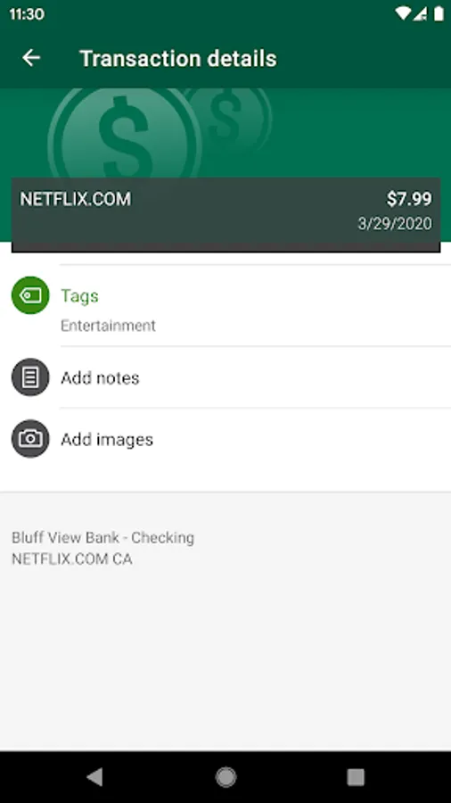 Add Tags, Notes, Images & Geo-Information: By enhancing transactions with custom tags, notes or photos of a receipt or check, you have the ability to stay organized and find exactly what you’re looking for when searching through your finances.