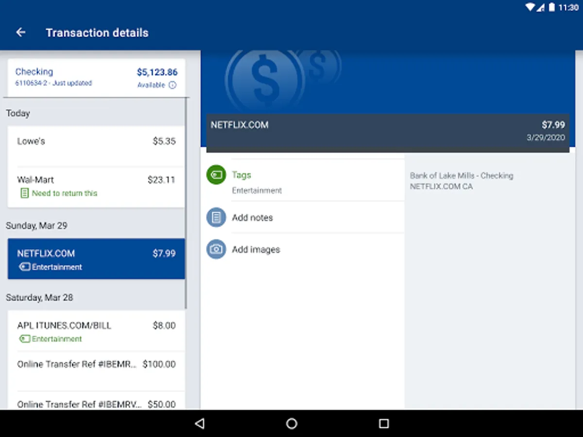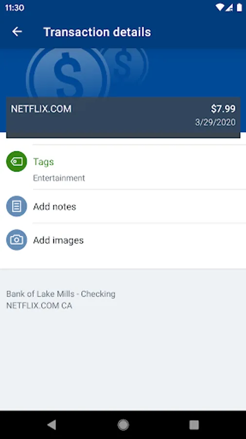 Add Tags, Notes, Images & Geo-Information: By enhancing transactions with custom tags, notes or photos of a receipt or check, you have the ability to stay organized and find exactly what you’re looking for when searching through your finances.