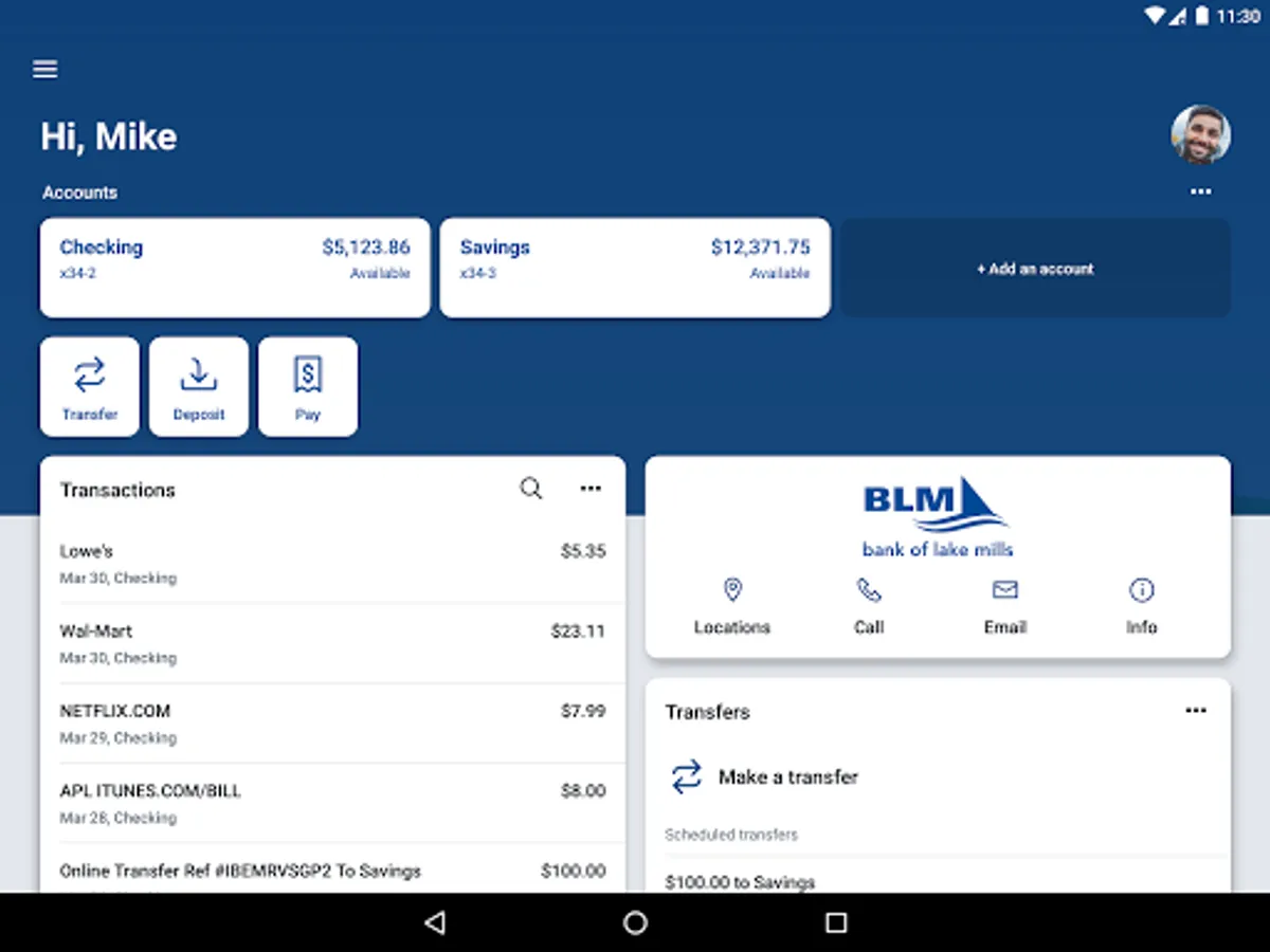 To use the Bank of Lake Mills App, you must be enrolled as a Bank of Lake Mills Internet Banking user. If you currently use our Internet Banking, simply download the app, launch it, and login with the same Internet Banking credentials. After you successfully login to the app, your accounts and transactions will begin updating.