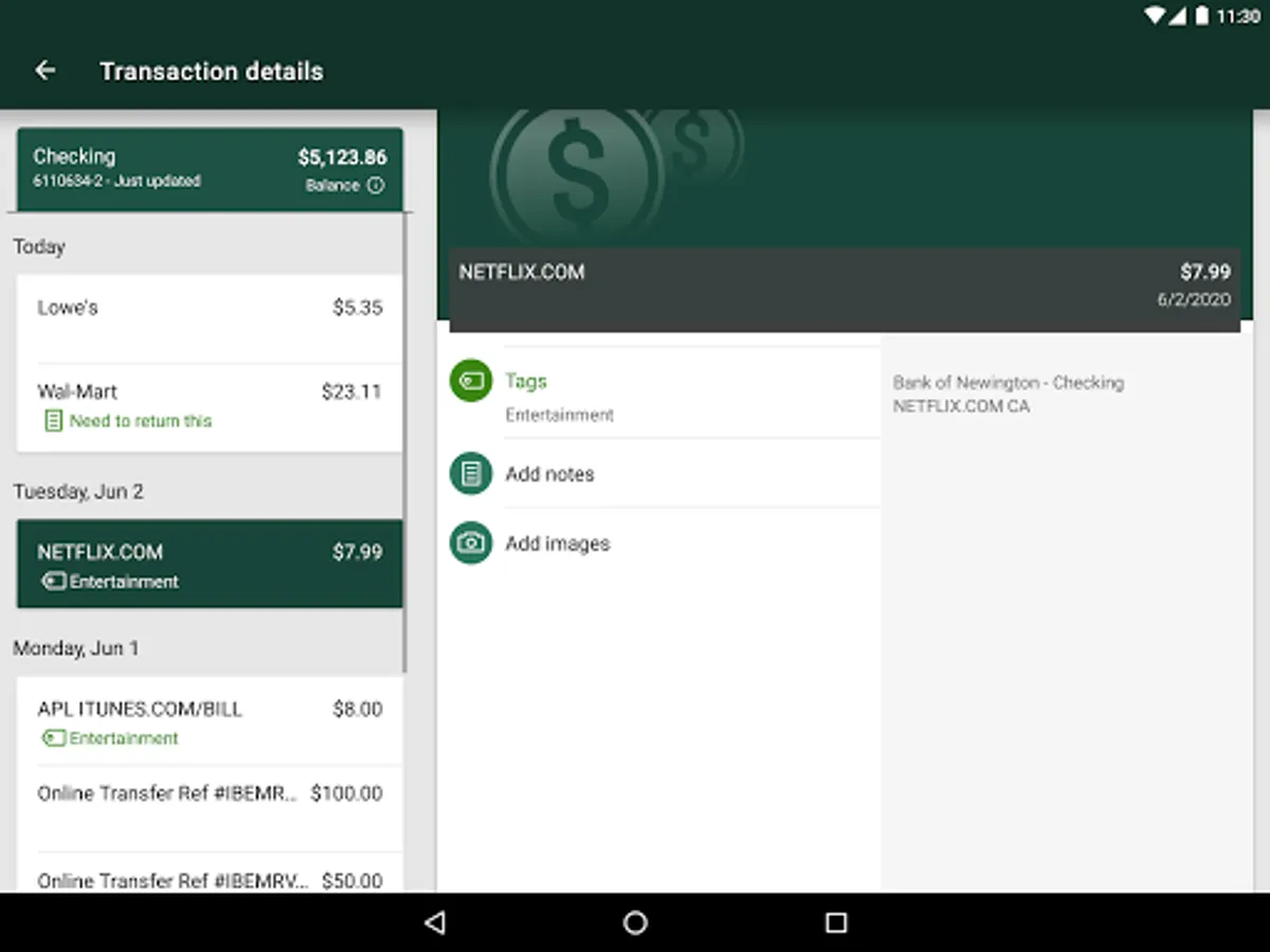 Add Tags, Notes, Images & Geo-Information: By enhancing transactions with custom tags, notes or photos of a receipt or check, you have the ability to stay organized and find exactly what you’re looking for when searching through your finances.