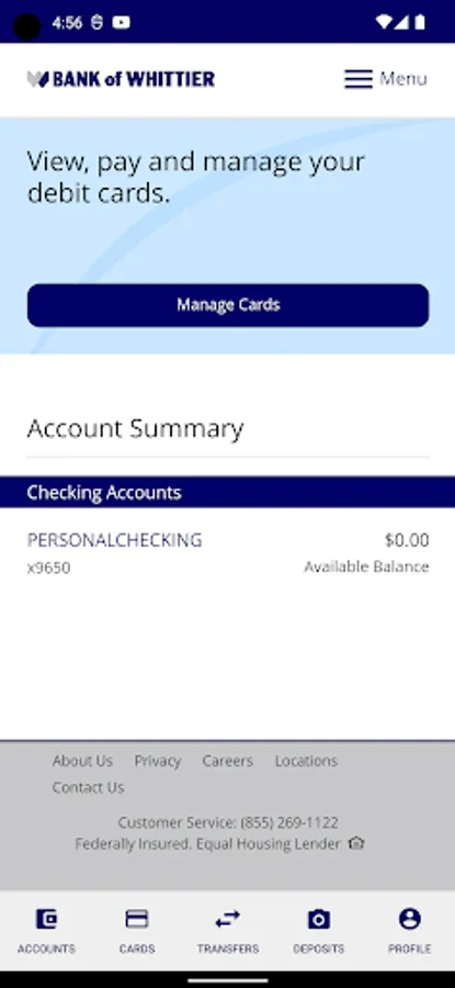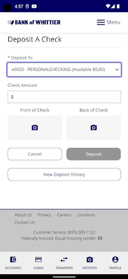 Questions? Please call 1-855-269-1122 or email mobile@bankofwhittier.com and we will happy to help you. Your mobile carrier’s message and data rates may apply.