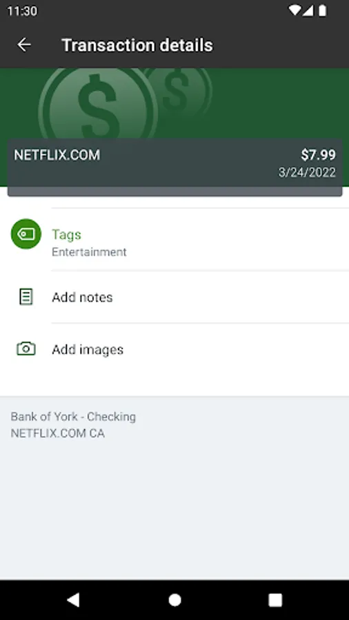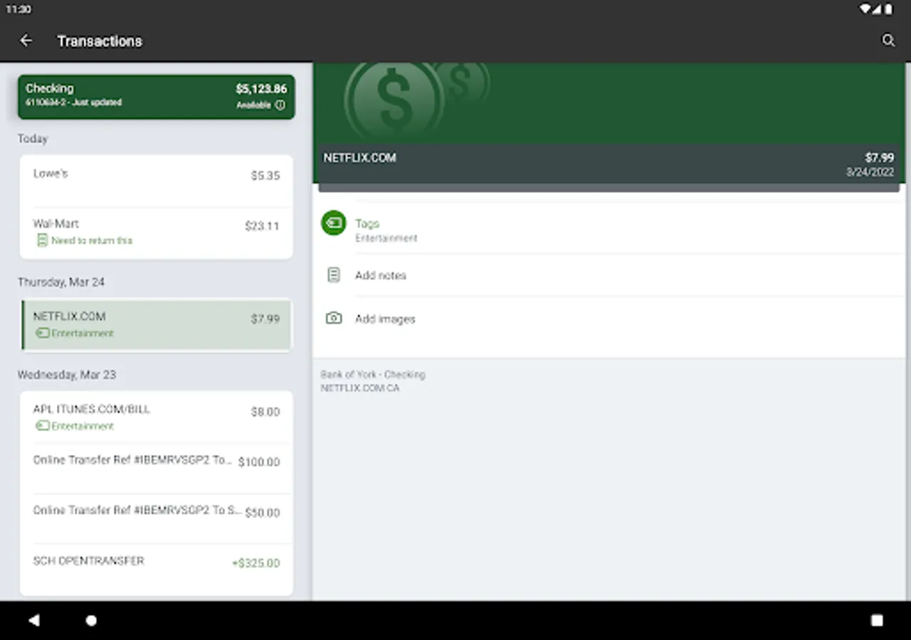 · Keep your transactions organized by allowing you to add tags, notes and photos of receipts and checks.