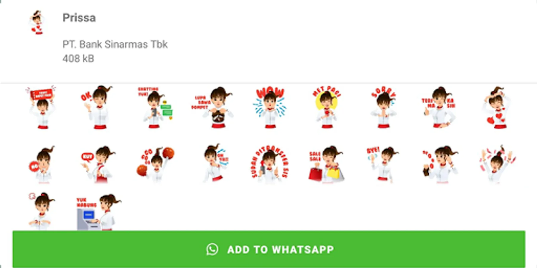 PRISSA Sticker (from Sinarmas Bank) is an official product issued by Sinarmas Bank in affiliation with WhatsApp Inc. The name and trademark are the property of PT. Bank Sinarmas Tbk.