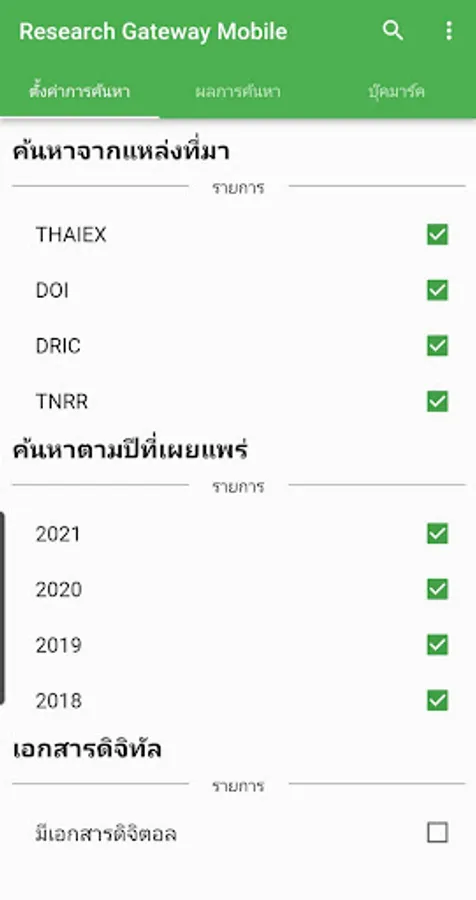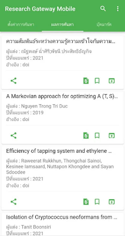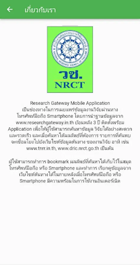 เป็นช่องทางในการเผยแพร่ข้อมูลงานวิจัยผ่านทางโทรศัพท์มือถือ Smartphone โดยการนำฐานข้อมูลจาก www.researchgateway.in.th ย้อนหลัง 3 ปี ติดตั้งพร้อม Application เพื่อให้ผู้ใช้สามารถค้นหาข้อมูล วิจัยได้อย่างสะดวกและรวดเร็ว และเมื่อค้นหาได้ผลลัพธ์ที่ต้องการ รายการที่ค้นพบจะเชื่อมโยงไปยังเว็บไซต์ข้อมูลต้นทาง ของงานวิจัย อาทิ เช่น www.tnrr.in.th, www.dric.nrct.go.th เป็นต้น
