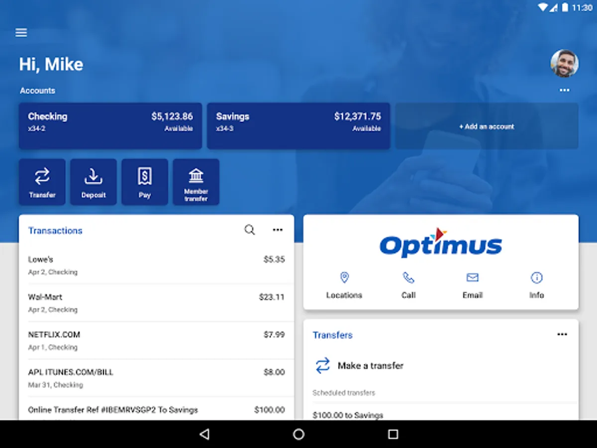 To use the Optimus App, you must be enrolled as an Optimus Internet Banking user. If you currently use our Internet Banking, simply download the app, launch it, and login with the same Internet Banking credentials. After you successfully login to the app, your accounts and transactions will begin updating.