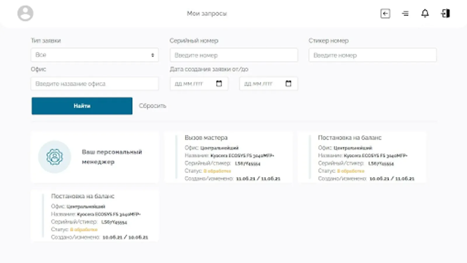 You have 3 MFPs, 1 printer, 1 water cooler, 1 air conditioner and 10 computers in your office. You register in the application and start all this equipment there. Further, for example, in the event of a breakdown of equipment or the need to replace the cartridge in the printer, you open the application and make an appropriate application. The task is completed, you can engage in profile business. Application creation time - no more than 1 minute.