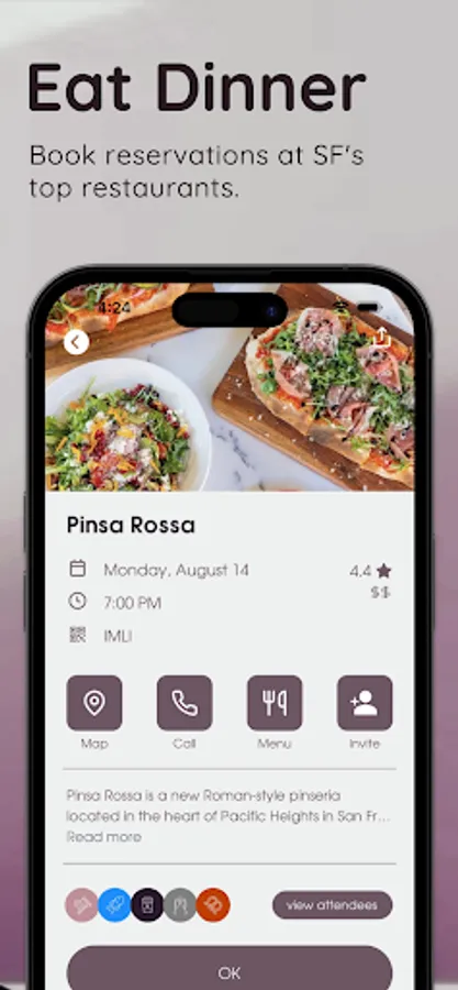 Banquette is all about meeting IRL and creating connections over dinner. We take care of all the heavy lifting, from finding the perfect group and restaurant, to providing fun icebreakers and games in the app. All you have to do is show up and enjoy the company of like-minded people who share your interests.