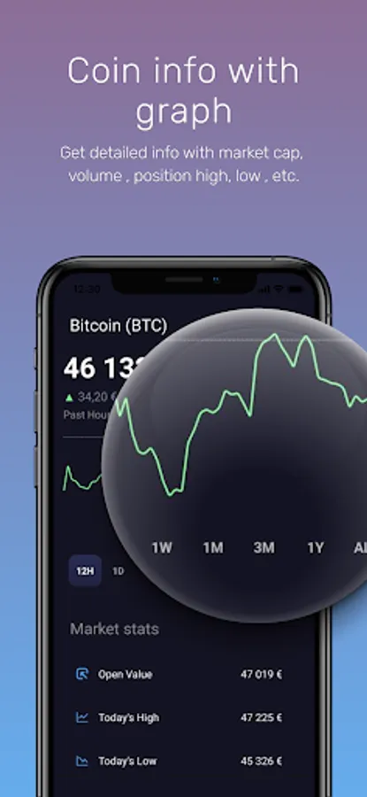 app. See coin info with market cap, volume, position, high, low, etc.