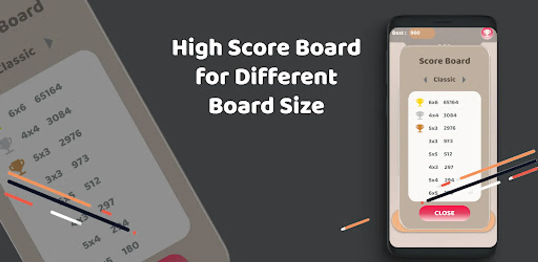 high score and leaderboard for different board sizes.