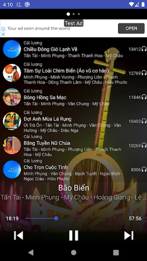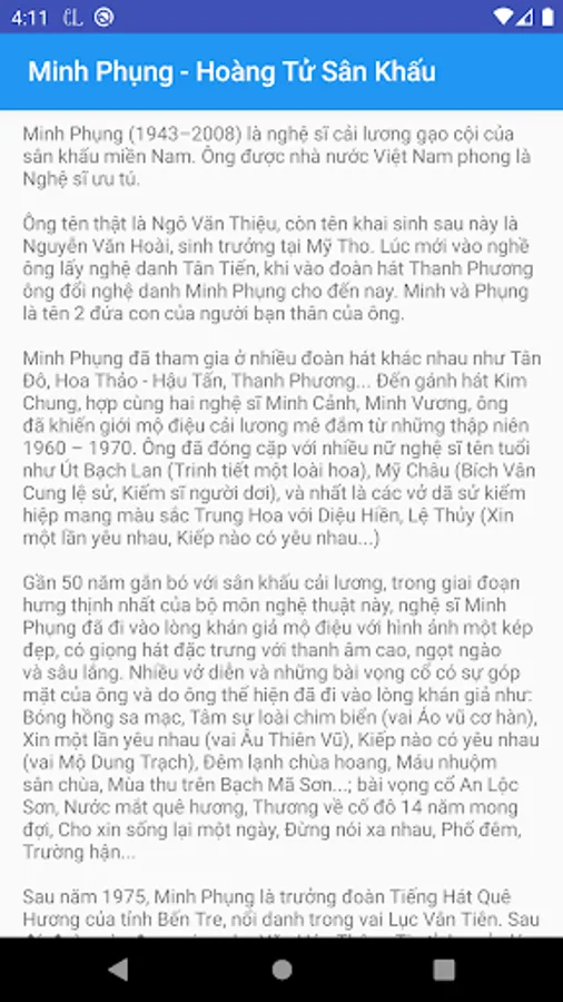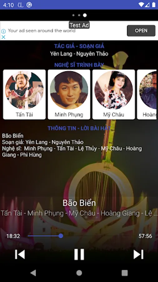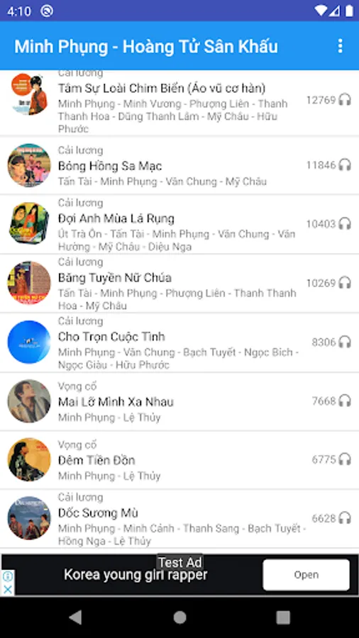 With this application, you will enjoy the best songs of artist Minh Phung with other famous singers such as Le Thuy, Phuong Lien, Bach Tuyet, Ngoc Giau, Tan Tai, Minh Vuong, Minh Canh, ...