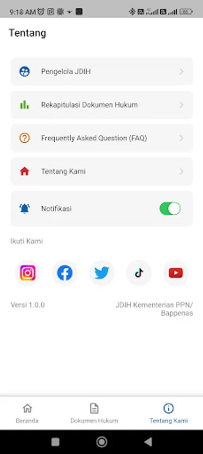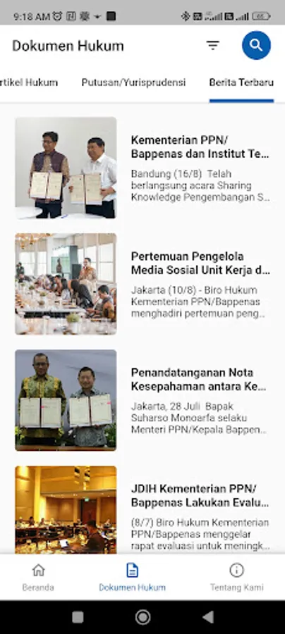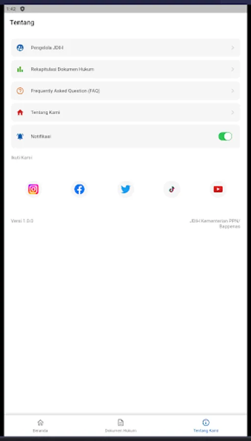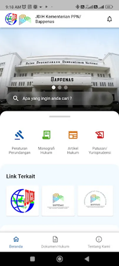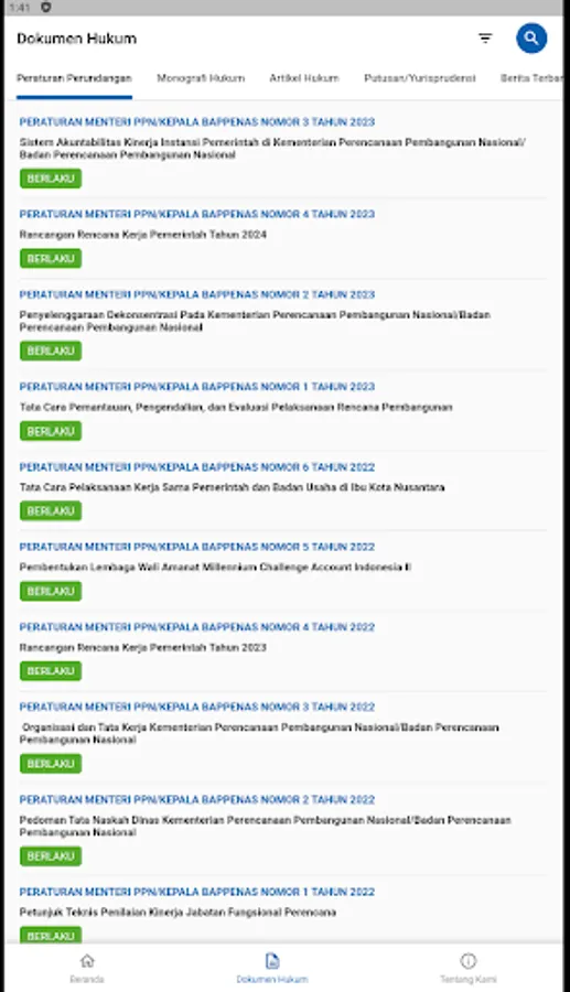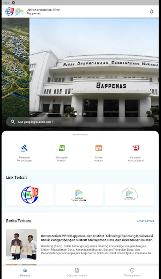JDIH Ministry of National Development Planning/Bappenas is an application that was built to carry out some of the main tasks and functions of the Legal Bureau of the Ministry of National Development Planning/Bappenas, namely the preparation of documentation and information on laws and regulations in the field of national development, especially those related to the main tasks and functions of the Ministry of National Development Planning/Bappenas .