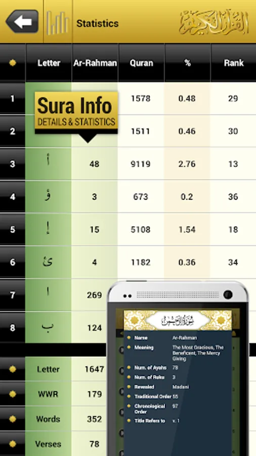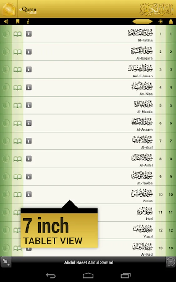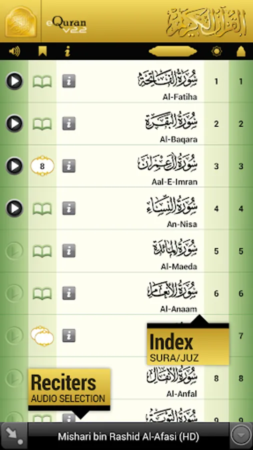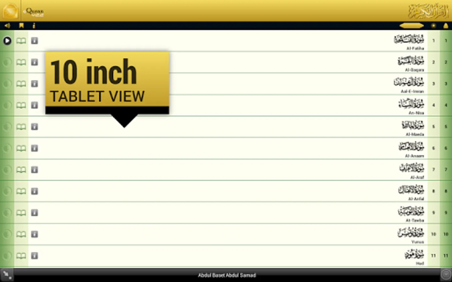 » Multi-Touch surah index with a spacious and smooth tracking that lets you jump directly to display juzz/para, surah, play audio, sura information and statistics in single touch.