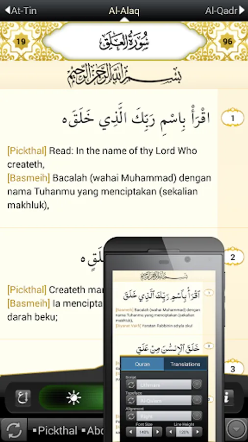 » Synchronized display of the ayahs and/or selected translation(s) during playback.