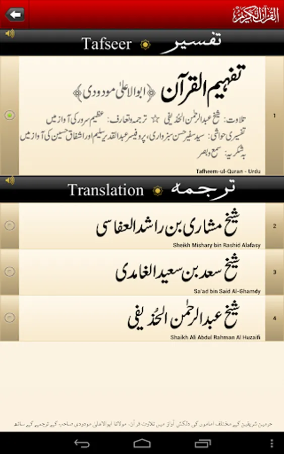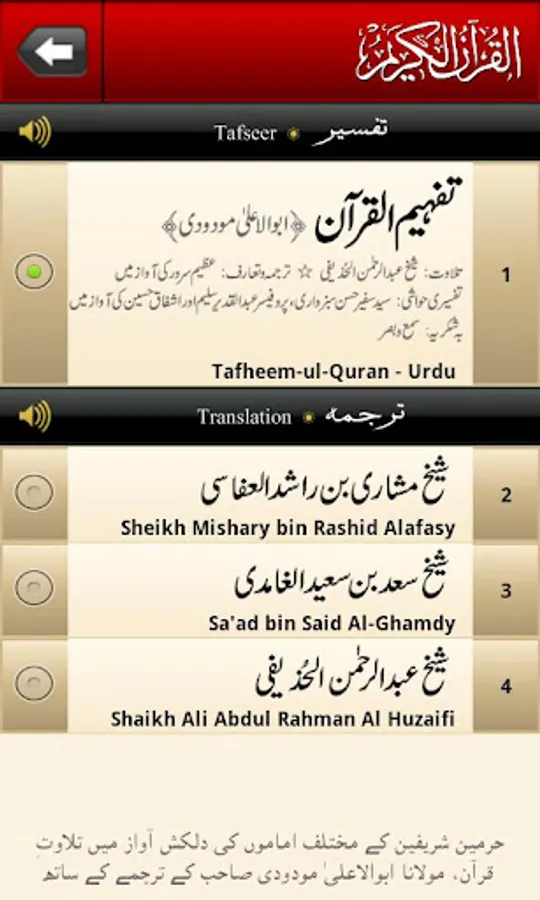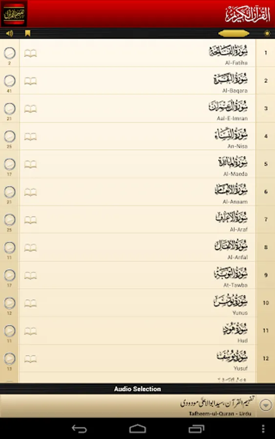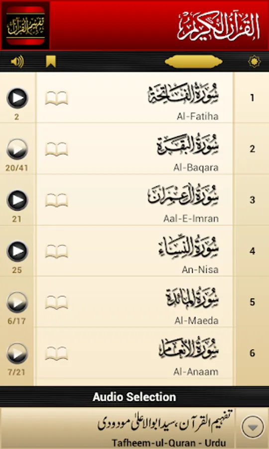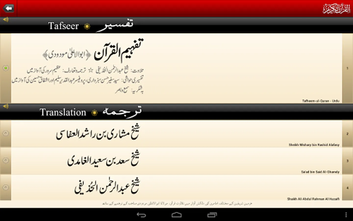 Tafheem-ul-Quran - a complete Qur’an with translations & tafseer by Moulana Syed Abul Ala Moududi. Also includes sura introductions and audio recitations with Urdu tarjuma by Moulana Moududi. A complete app to read, recite and learn the Holy Qur’an in Urdu.
